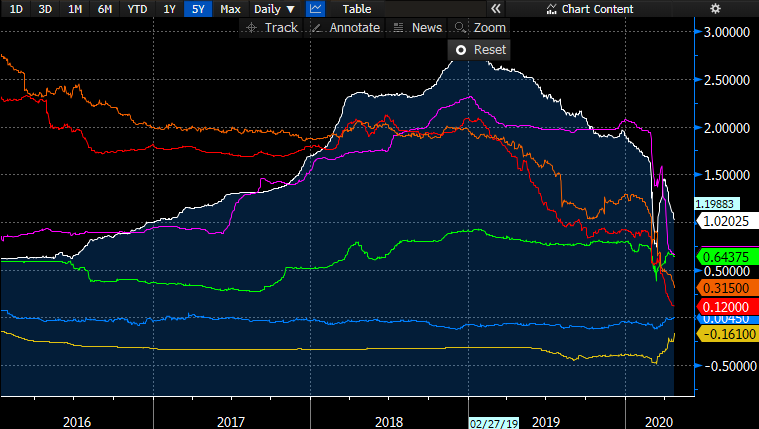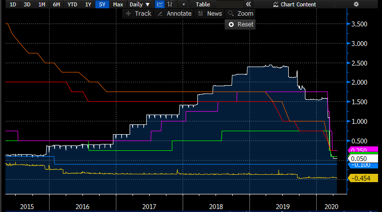 Returning to markets after 3 months of golf (hcp18, don’t get too excited….), freediving and eventually lockdown, I’m confronted with something beyond the normal professional ennui that I’ve become accustomed to from my friends in the macro investing community. It’s natural for any set of professionals to mourn the good old days when things were simpler/easier/better but the fact that interest rates are zero in many currencies gives the mourning a new tone. Here in all their glory are the overnight interest rates we face in the so called developed world. The UK and US are grudgingly included despite ones inability to provide PPE for frontline medical staff, and the other’s president recommending injecting disinfectant: